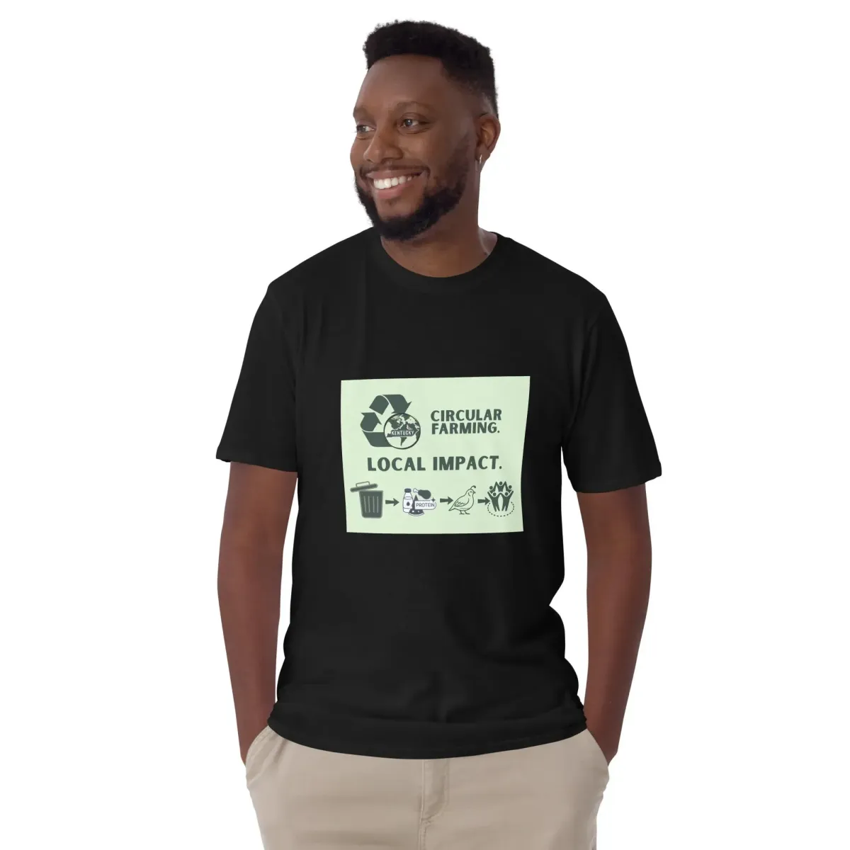 Show your commitment to sustainability with our Circular Farming Tee, featuring a bold graphic that celebrates local innovation and eco-conscious living. The design illustrates the journey from waste to nourishment through a circular system—highlighting a trash bin, factory, bird, and a hand holding a chicken drumstick, all framed by a recycling symbol. Finished with the “kentuckyproteincompany.com” web address, this shirt is perfect for advocates of regenerative agriculture and community-driven protein solutions. Soft, breathable, and conversation-starting.