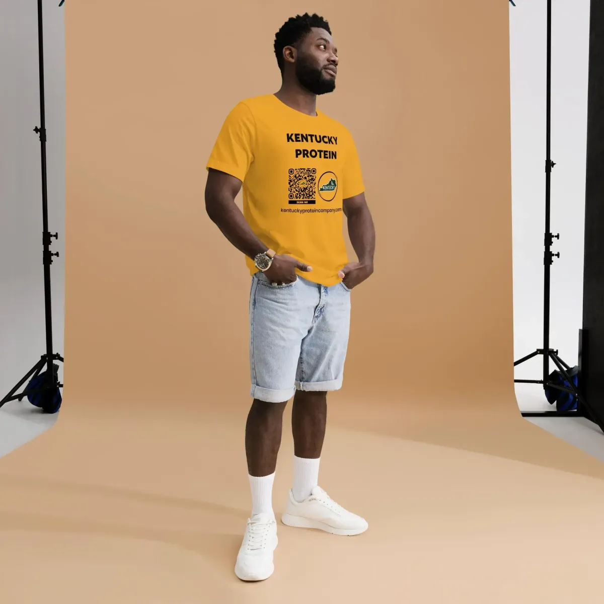 White athletic t-shirt featuring bold “KENTUCKY PROTEIN” branding, a scannable QR code, green leaf logo, and website URL. Designed for gym visibility and brand outreach in fitness spaces