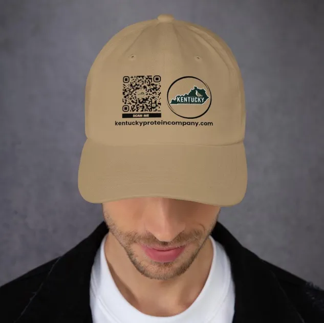 Show your support in style with this crisp white baseball cap featuring the bold Kentucky Protein Company logo. The front design includes a sleek state-shaped emblem with “KENTUCKY” proudly displayed, paired with a scannable QR code and website URL for instant access to company info. Perfect for outreach events, team wear, or casual promotion, this cap blends clean aesthetics with functional branding. Durable, comfortable, and designed to spark curiosity wherever you go.